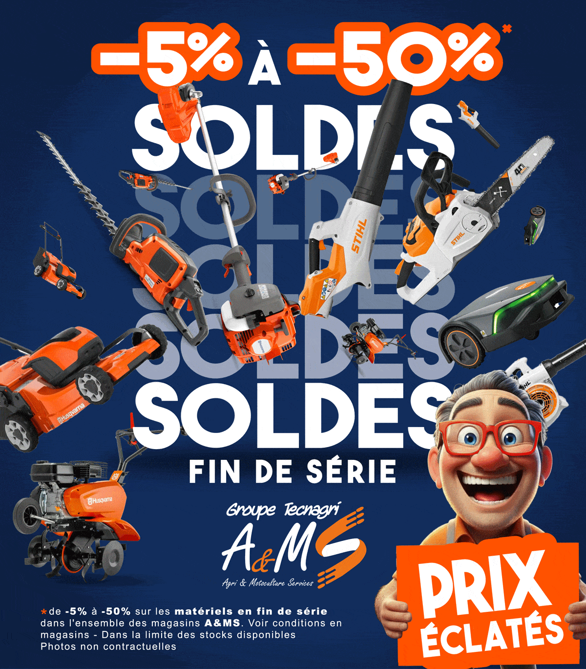 Nos soldes de fin de série sont lancés avec des remises exceptionnelles de -5% à -50%* sur une large sélection de matériels de motoculture et d’entretien des espaces verts.